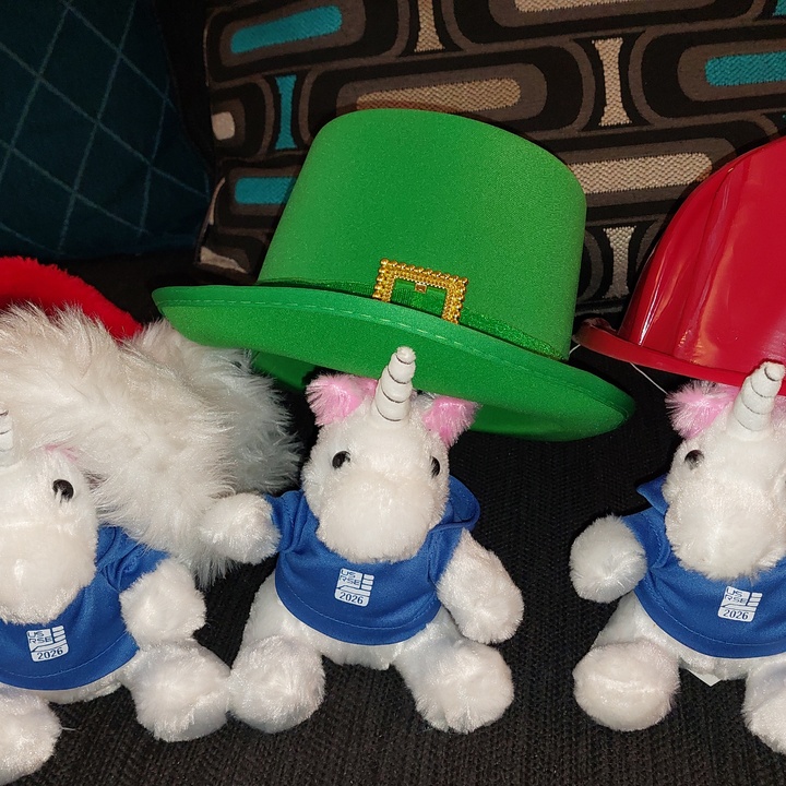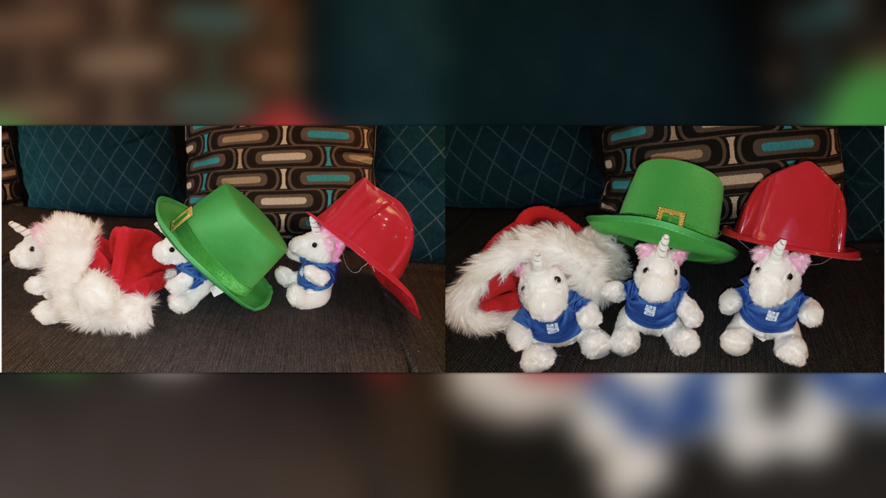 Our brave little unicorn squad has gathered to kick off the annual fundraiser and this year they’ve gone all-in on “creative headwear.” We have the festive holiday unicorn who may or may not be stuck in the Santa hat, the ambitious unicorn attempting Irish flair beneath a hat larger than its entire body, and the safety-minded unicorn proudly modeling a fire helmet for reasons known only to them.